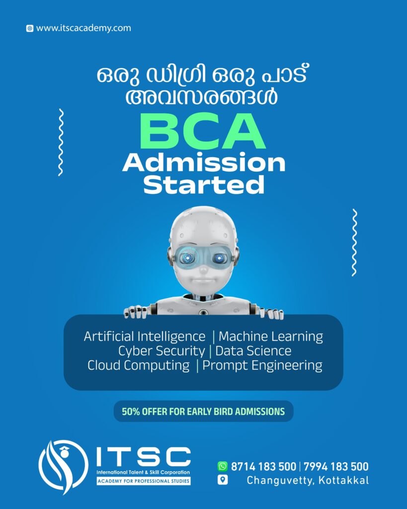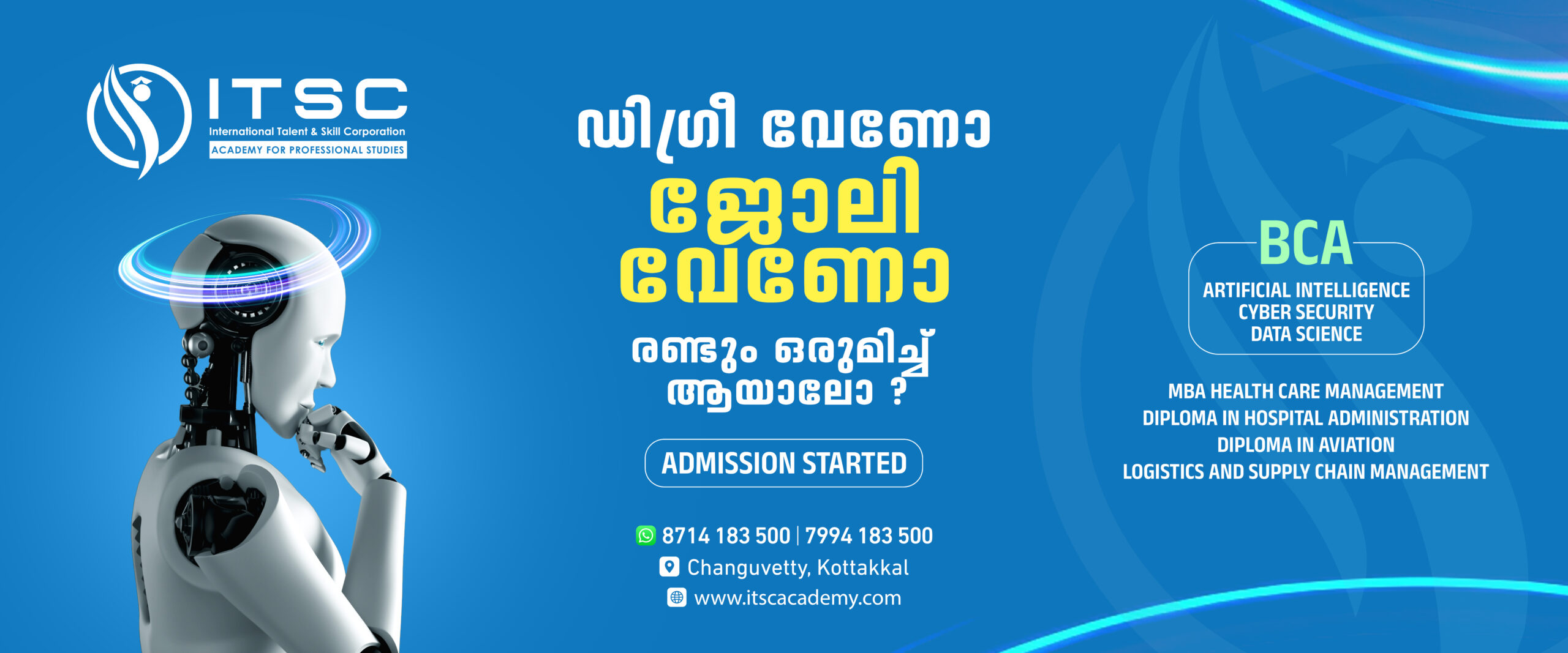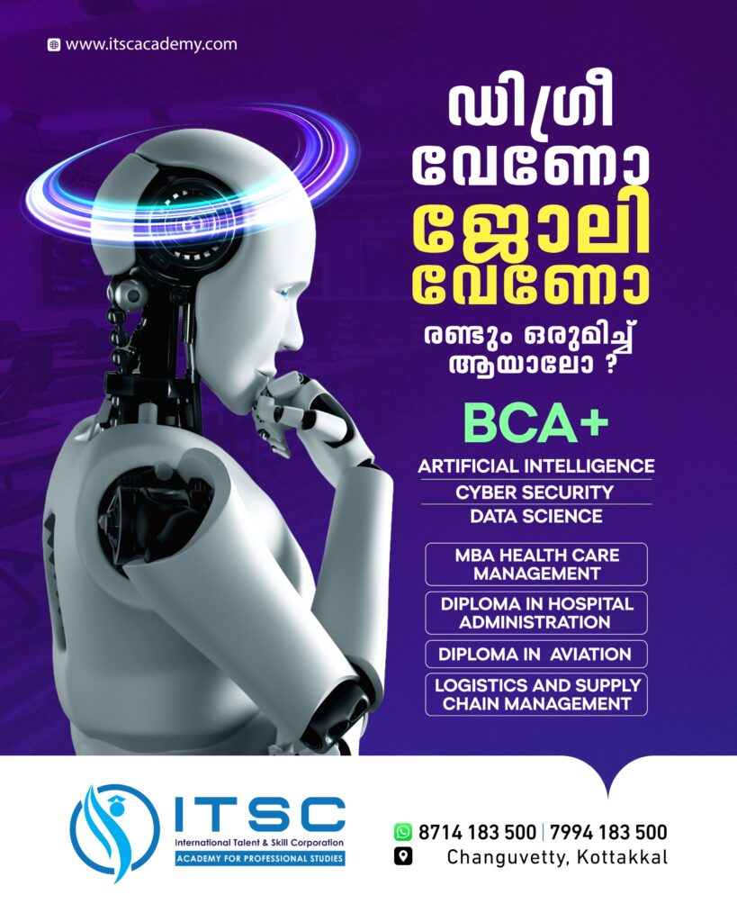 ITSC Academy, Kottakkal is one of the top career-oriented institutions dedicated to equipping students with future-proofed skills. We provide courses that are industry-relevant in the area of BCA with AI & ML, Cyber Security, Data Science, MBA in Healthcare, Diploma in Hospital Administration, Aviation, and Logistics & Supply Chain Management.